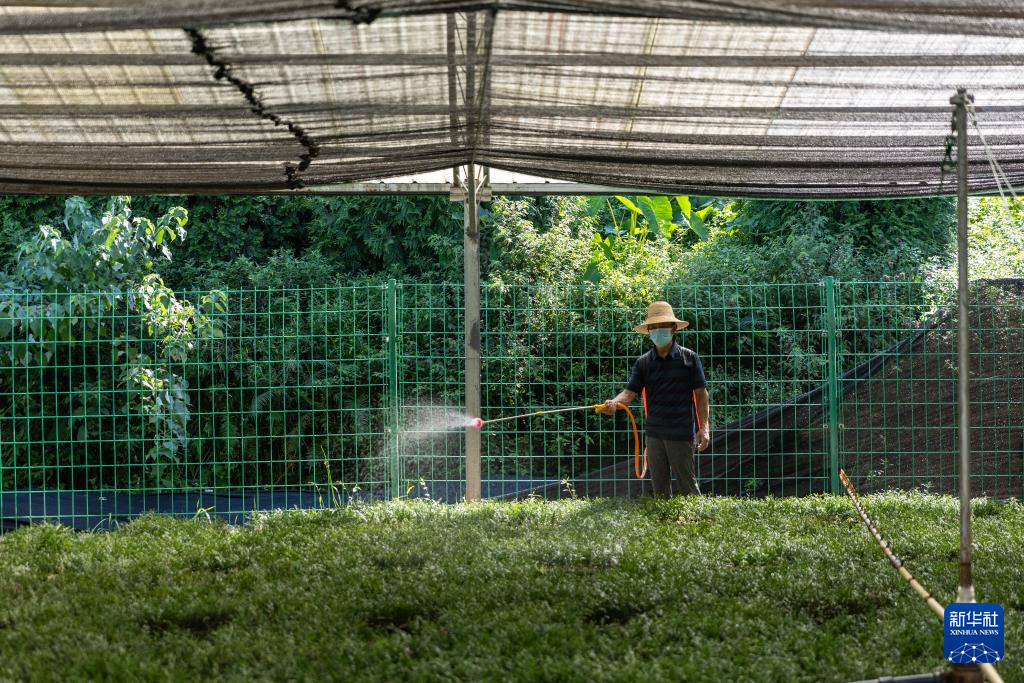 8月7日,在位于重庆市开州区温泉镇乐园村的重庆雪宝山国家级自然保护区崖柏繁育科研基地,工作人员为崖柏幼苗喷洒防治病虫害的药水。