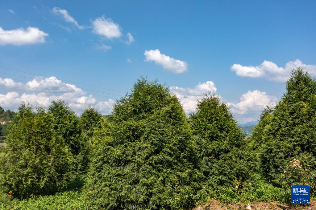 这是8月7日在位于重庆市开州区温泉镇乐园村的重庆雪宝山国家级自然保护区崖柏繁育科研基地拍摄的崖柏(无人机照片)。