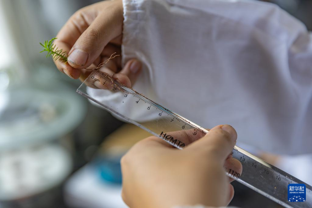 8月7日,在位于重庆市开州区温泉镇乐园村的重庆雪宝山国家级自然保护区崖柏繁育科研基地,科研人员在实验室对崖柏种子幼苗进行根系调查。