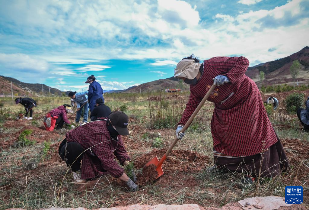 6月5日,在西藏自治区芒康县林业产业扶贫苗圃基地,当地林业工人在栽种崖柏幼苗。