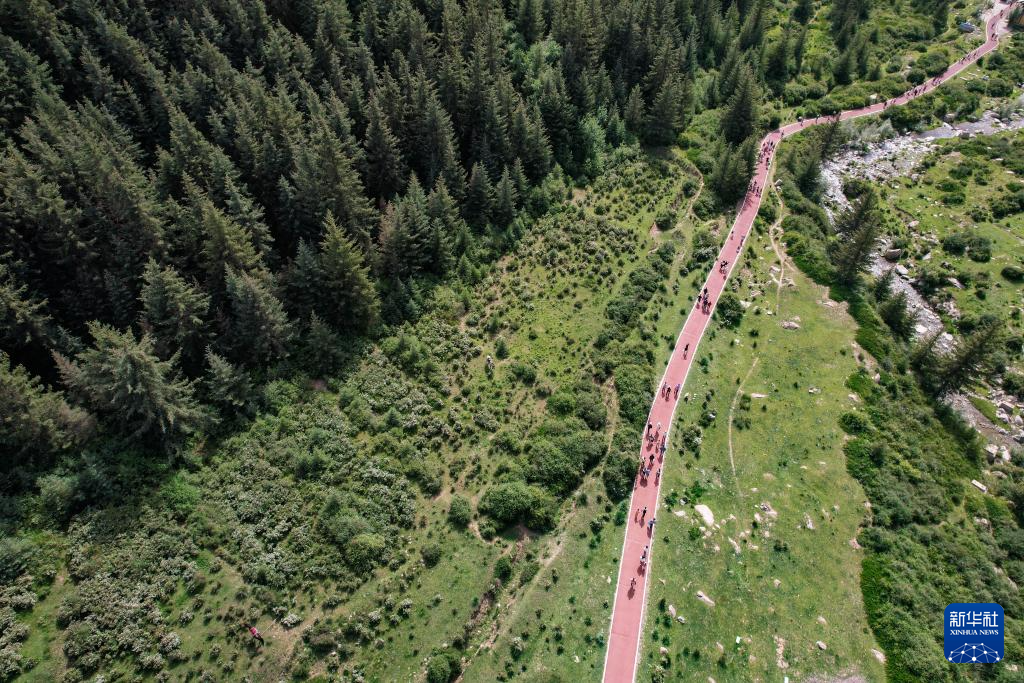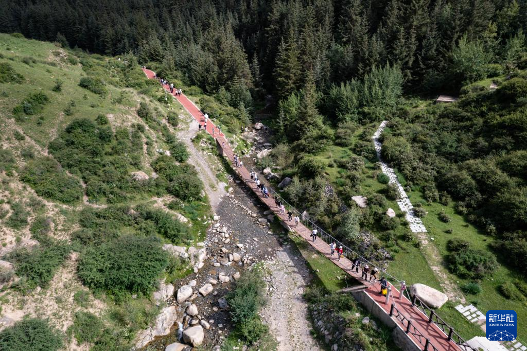 7月11日,游客在焉支山赏景游玩(无人机照片)。