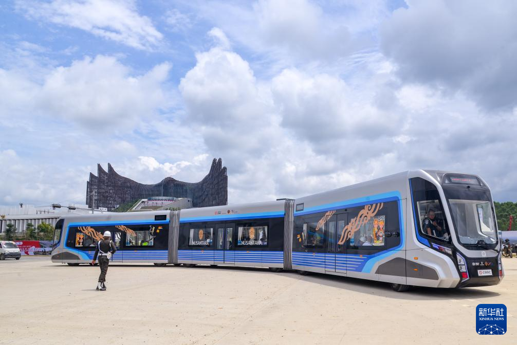 这是8月13日在印度尼西亚新首都努山塔拉拍摄的智轨系统。