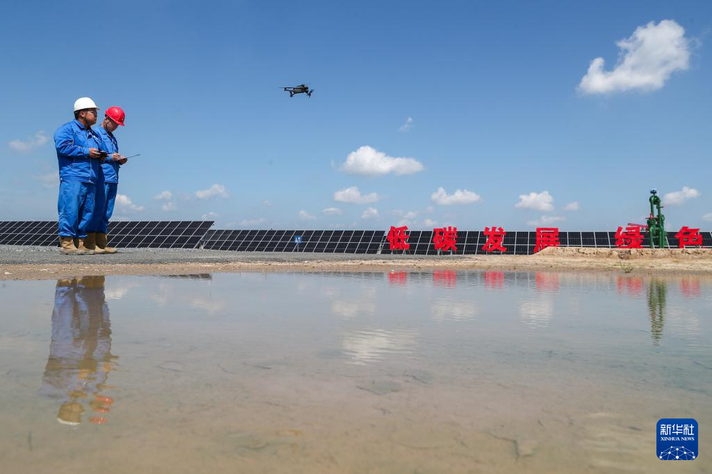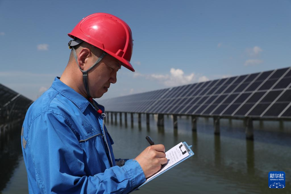 8月8日,在大庆油田星火水面光伏示范工程现场,工作人员检查光伏发电设备。