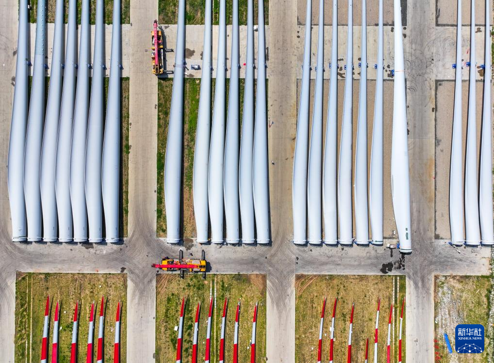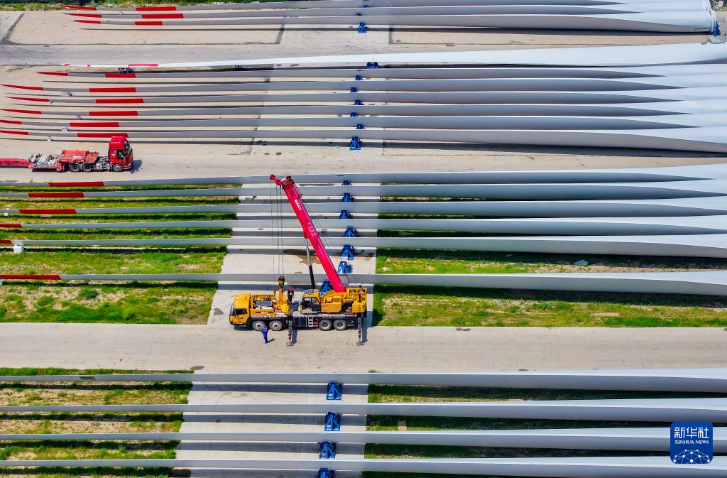 7月19日,在内蒙古蒙东(通辽)风电装备制造产业基地,工作人员驾驶吊车摆放风机叶片(无人机照片)。
