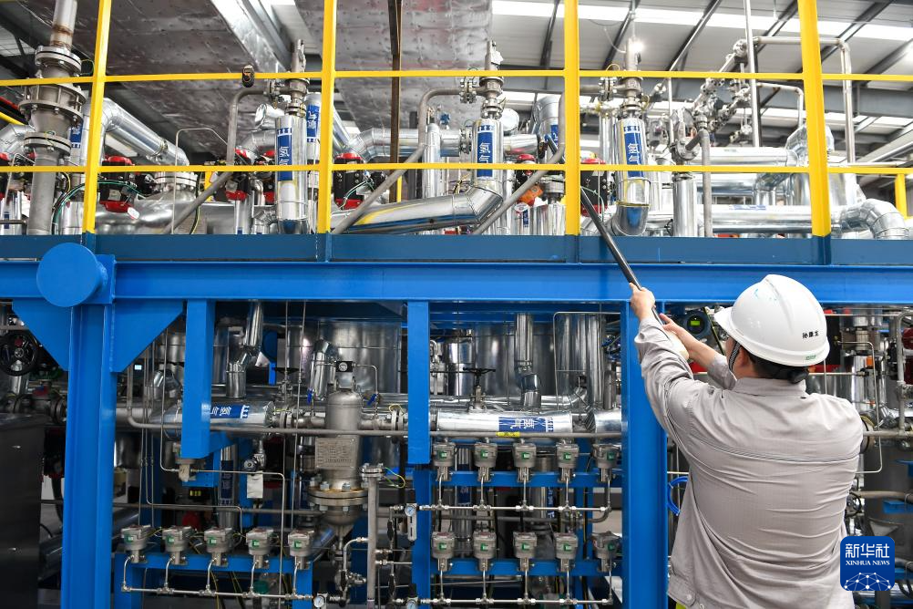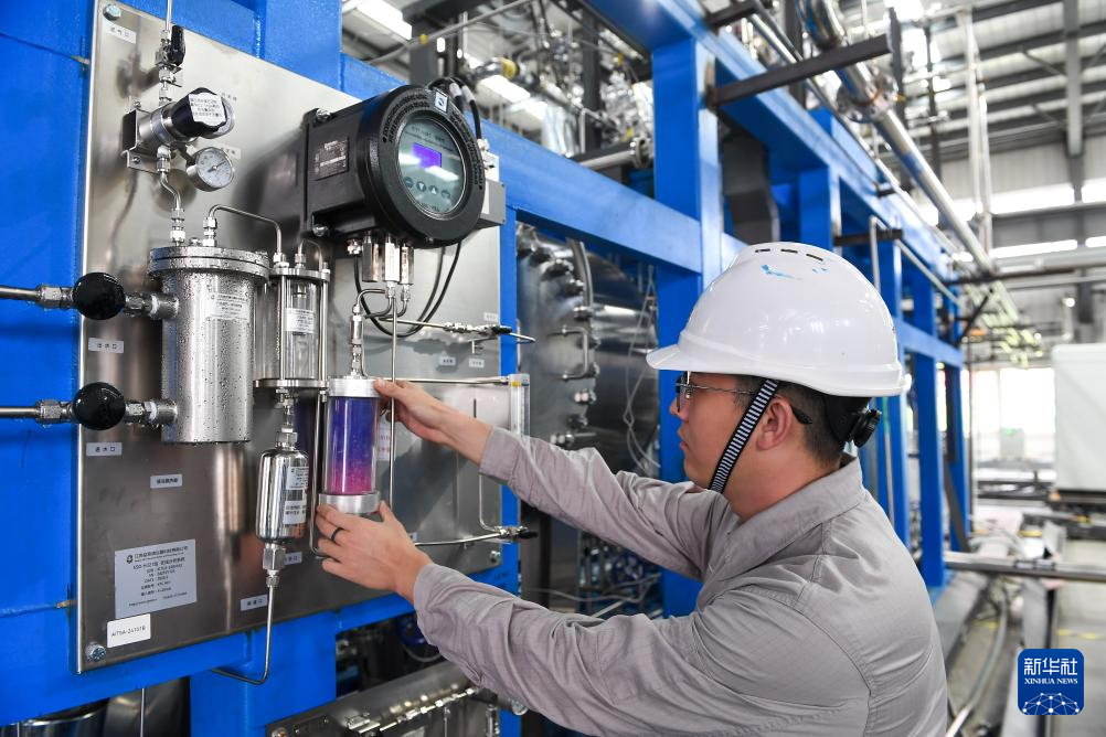 8月12日,在长春绿动氢能科技有限公司,工人查看制氢设备运行情况。