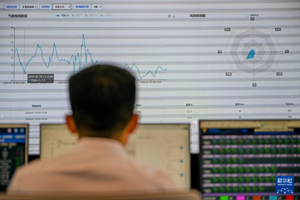 7月19日,在内蒙古通辽市一家新能源运维企业的集控指挥中心,工作人员实时监控风电数据。