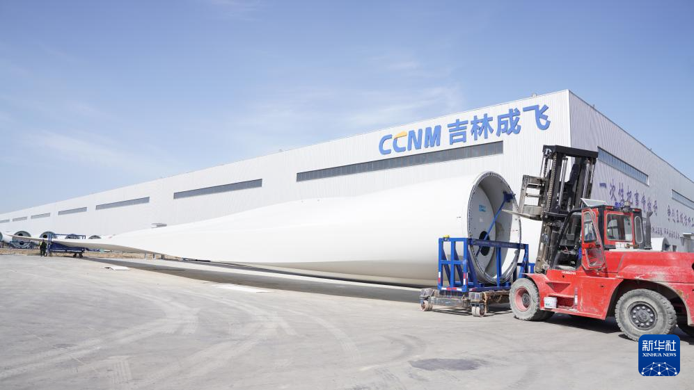 4月17日,在位于吉林省大安市的吉林重通成飞新材料股份公司大安公司,叉车在运送风机叶片。