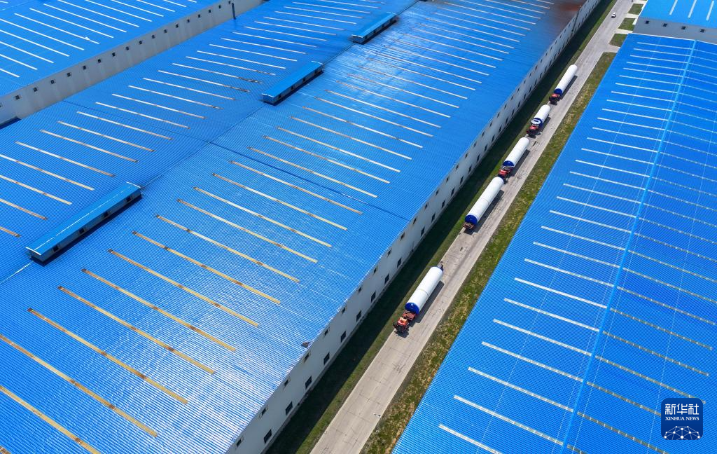 7月19日,在内蒙古蒙东(通辽)风电装备制造产业基地,一排卡车在运送风机塔筒(无人机照片)。