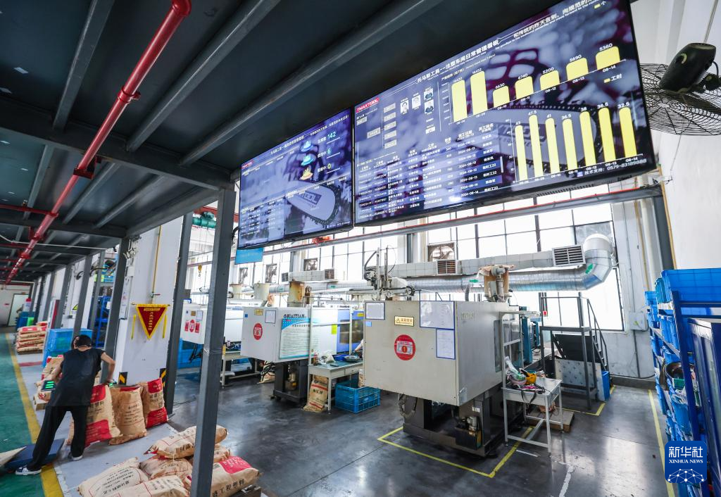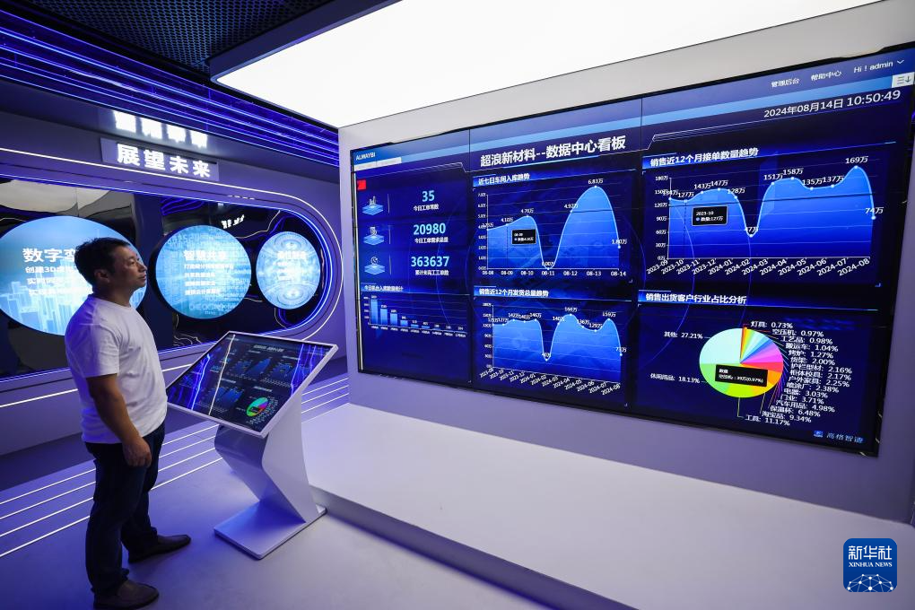 8月14日,在金华市金东区江东镇的浙江超浪新材料有限公司数字化车间内,工作人员在后台查看各条流水线的生产情况。