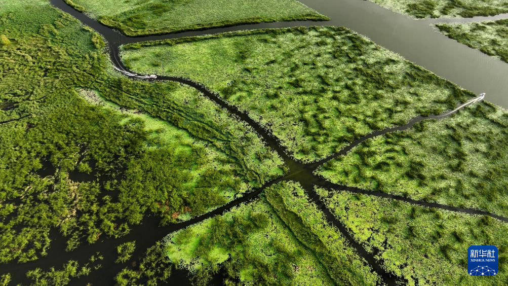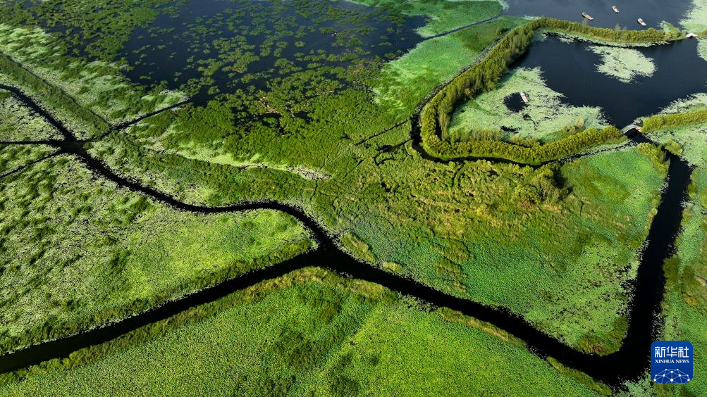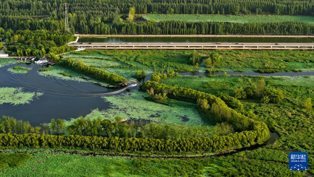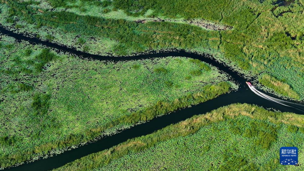 这是航拍的济宁市微山县驩城镇微山湖二级坝湿地公园景色(8月13日摄,无人机照片)。