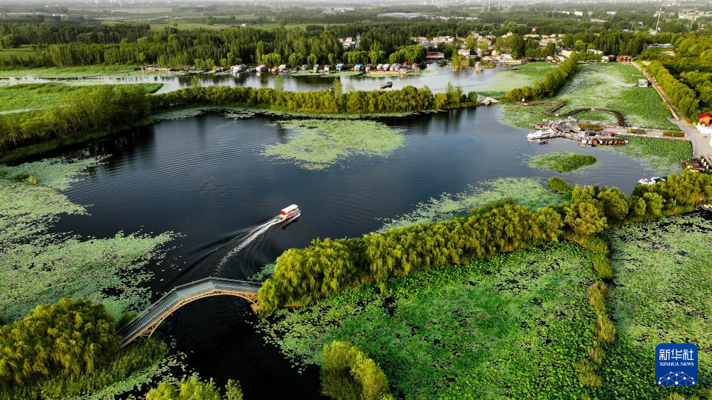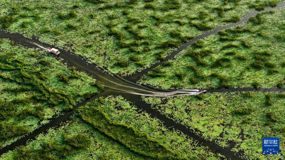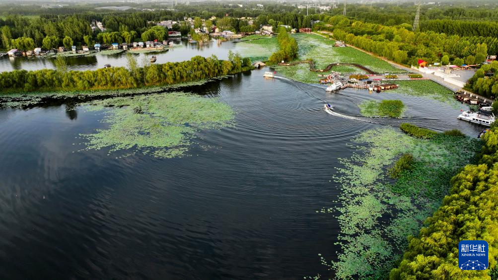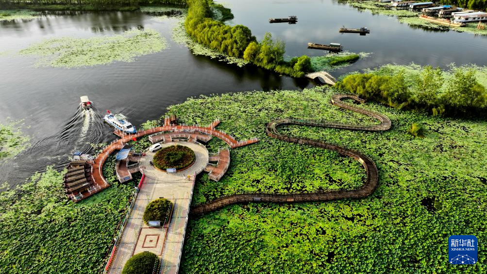 8月13日,在济宁市微山县驩城镇微山湖二级坝湿地公园,游船驶离码头(无人机照片)。