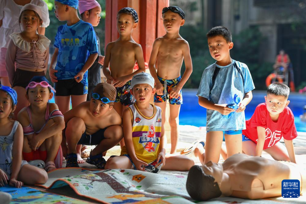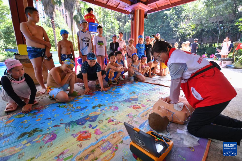 8月14日,在浏阳市荷花街道新月社区,志愿者(右)在游泳班上教孩子们心肺复苏急救知识。