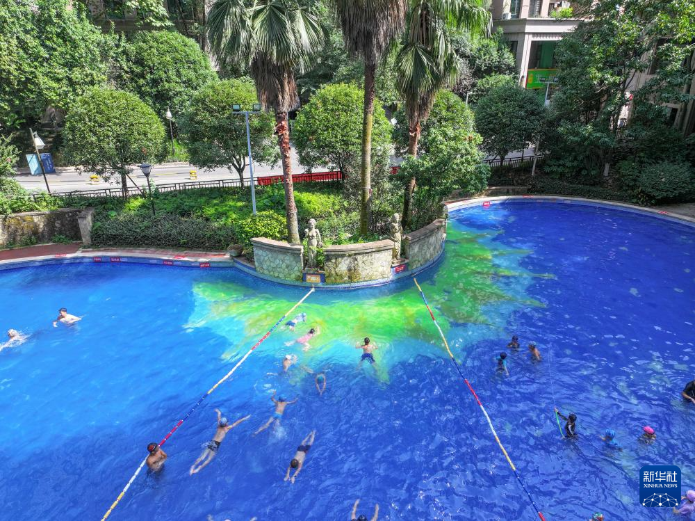 8月14日,在浏阳市荷花街道新月社区,孩子们在游泳老师的指导下练习游泳(无人机照片)。