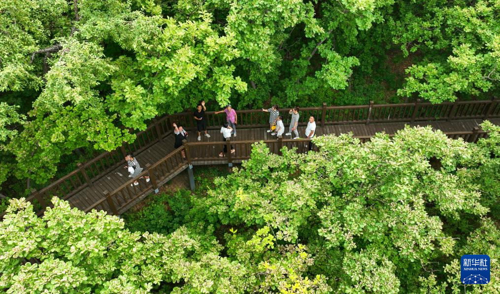 人们在龙江森工集团绥棱林业局生态文化旅游景区一处公园内散步(7月25日摄,无人机照片)。