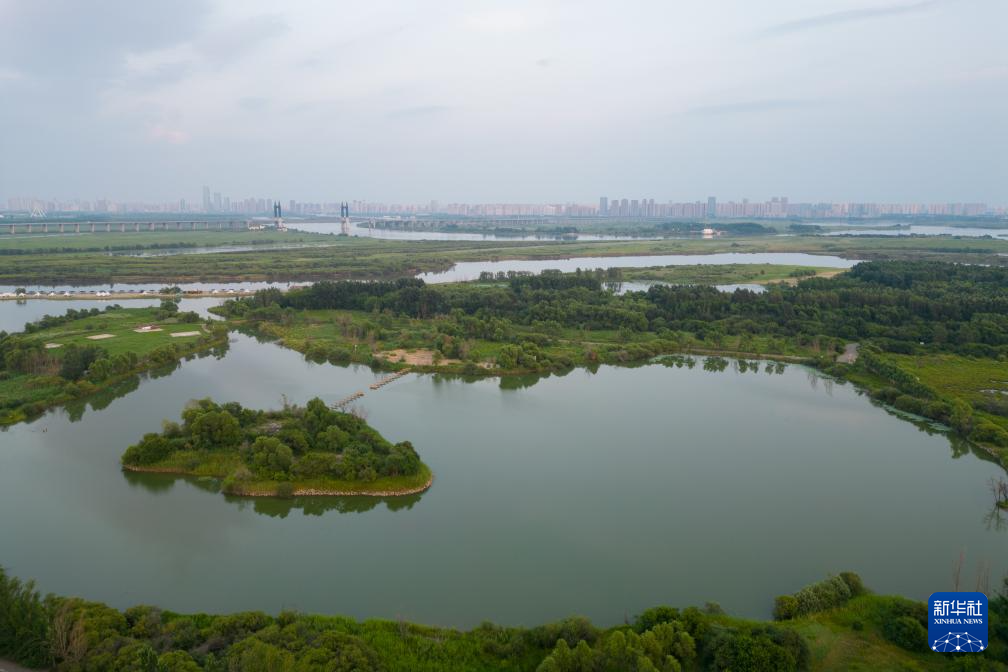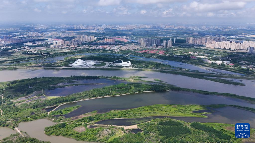 这是哈尔滨群力外滩生态湿地公园一角和周边城市景观(8月13日摄,无人机照片)。