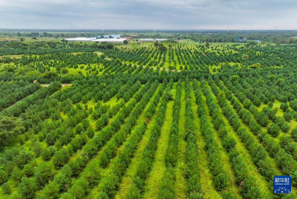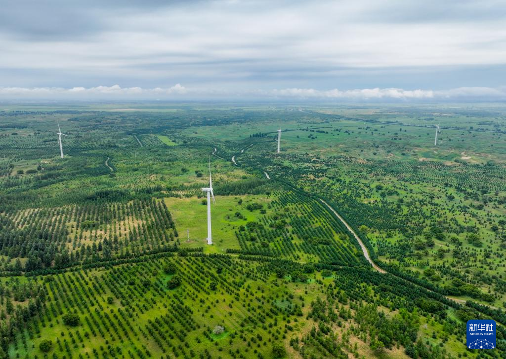 这是在内蒙古通辽市科尔沁左翼后旗,科尔沁沙地“双百万亩”综合治理工程努古斯台项目区内绿意盎然(无人机照片,8月3日摄)。