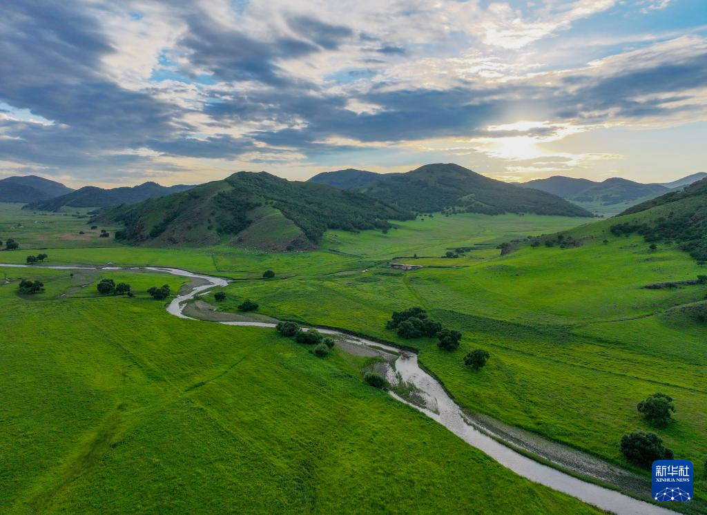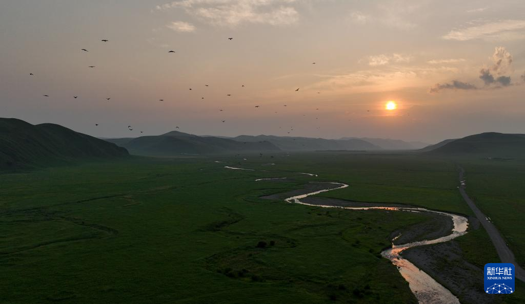 7月18日拍摄的内蒙古乌兰毛都草原日落景色(无人机照片)。