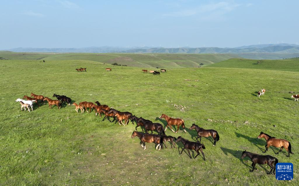 7月18日拍摄的内蒙古乌兰毛都草原上的马群(无人机照片)。