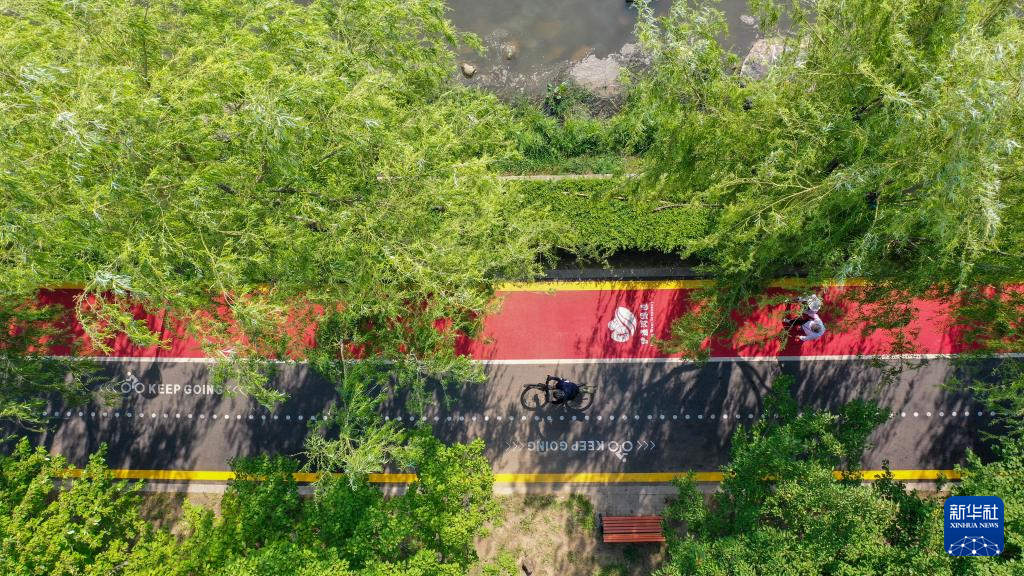 市民在长春伊通河滨水绿道上骑车、散步(7月2日摄,无人机照片)。