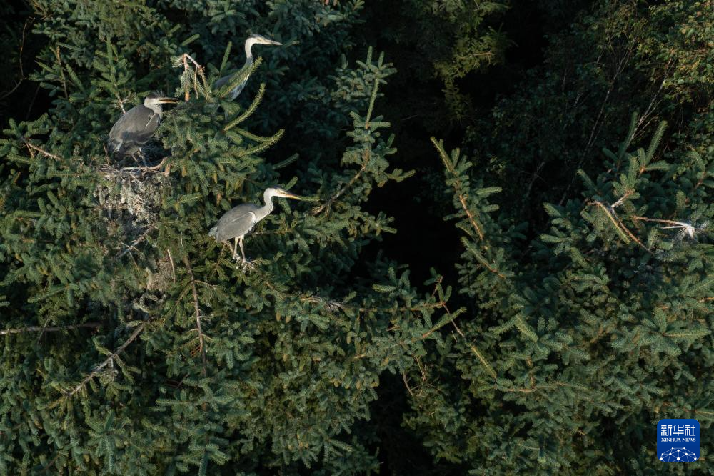 在龙江森工集团通北林业局公司施业区,国家三有保护动物苍鹭在鸟巢中休息(7月24日摄,无人机照片)。