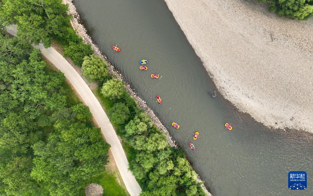 游客在流经内蒙古呼伦贝尔市扎兰屯市南木鄂伦春民族乡的雅鲁河上体验漂流(7月6日摄,无人机照片)。