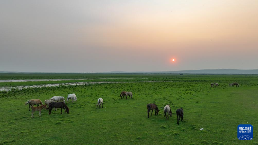 7月4日拍摄的内蒙古呼伦贝尔市陈巴尔虎旗草原落日(无人机照片)。