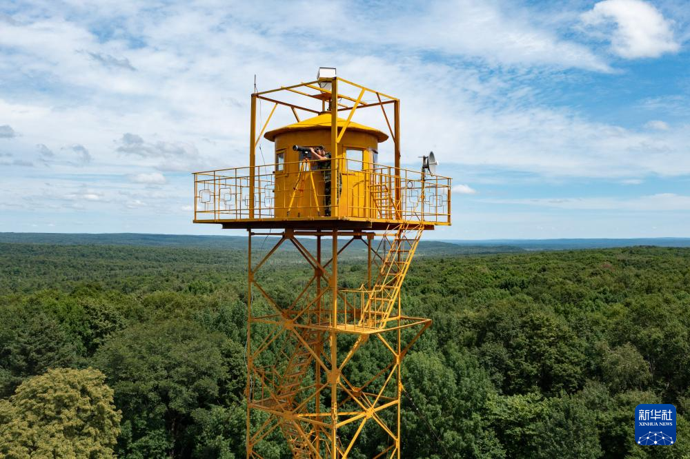 龙江森工集团绥棱林业局公司西北河林场,瞭望员在瞭望塔上工作(7月26日摄,无人机照片)。