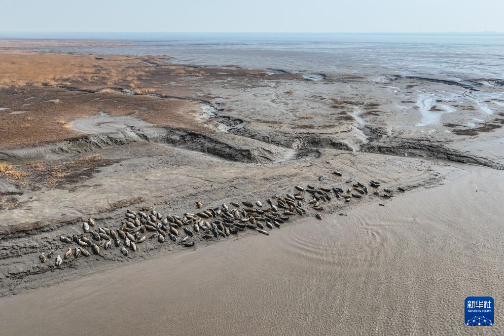 西太平洋斑海豹在辽宁盘锦三道沟海域的滩涂上休憩(4月9日摄,无人机照片)。