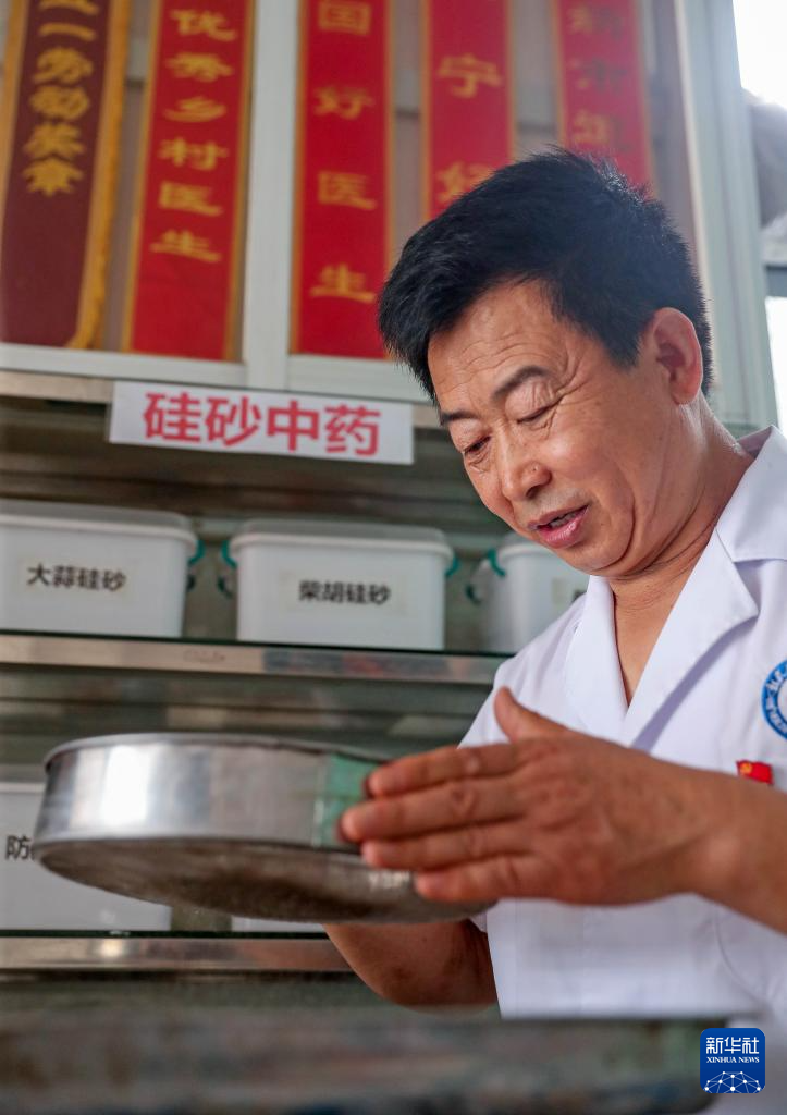 8月13日,梁春荣在诊室将适合入药的硅砂过筛。