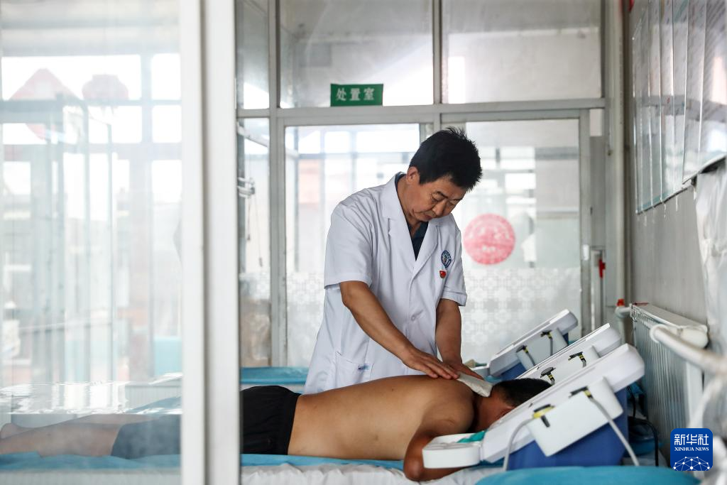 8月13日,梁春荣在诊室为患者做理疗。