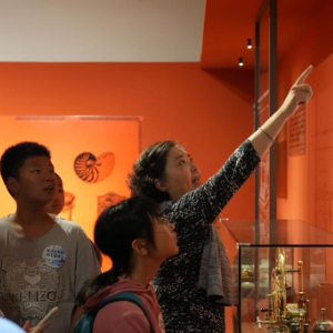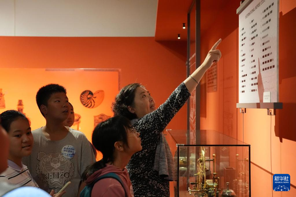 8月16日,在清华大学科学博物馆,孩子们在讲解员带领下参观。