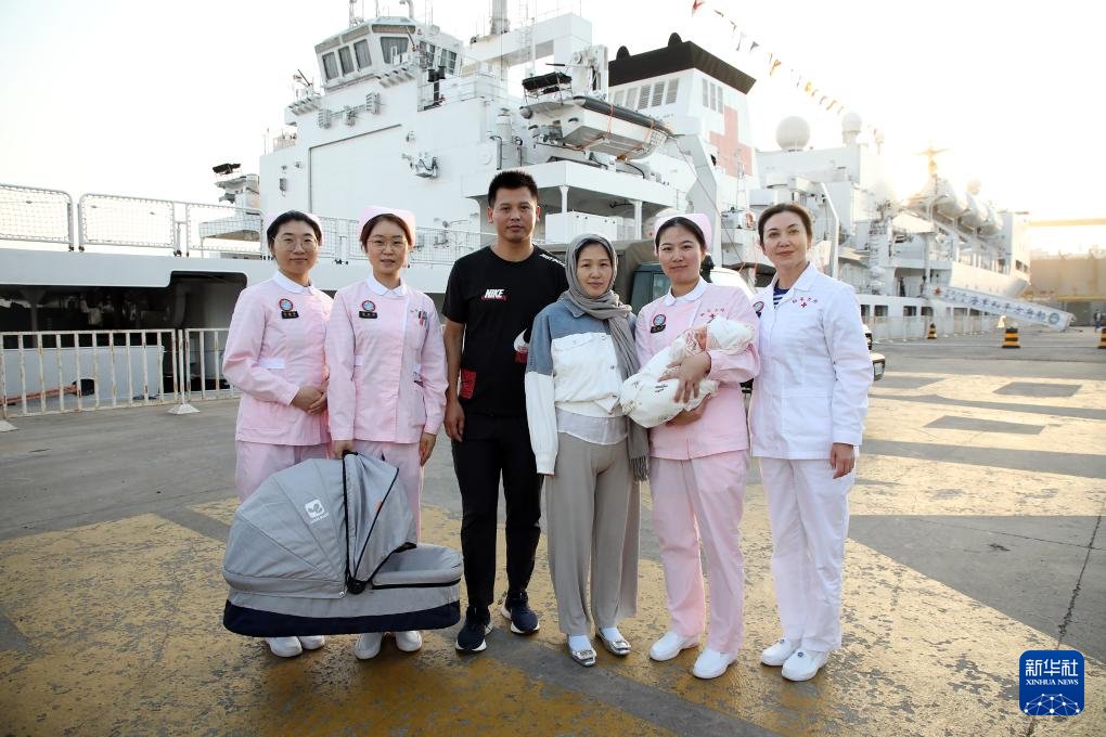 8月14日,在莫桑比克马普托,中国海军“和平方舟”号医院船医务人员送“和平宝宝”出院。