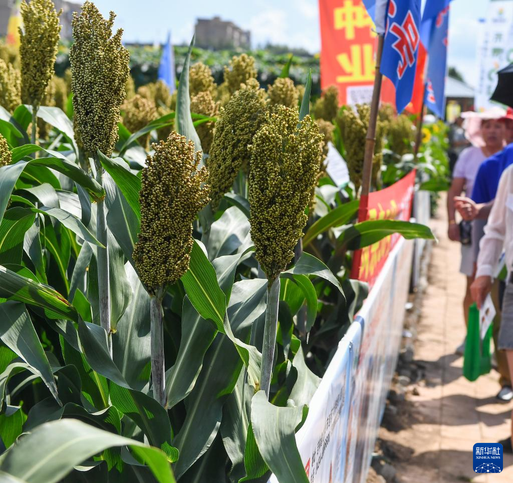 8月16日,参观者在长春农博会观看展出的优良农作物品种。
