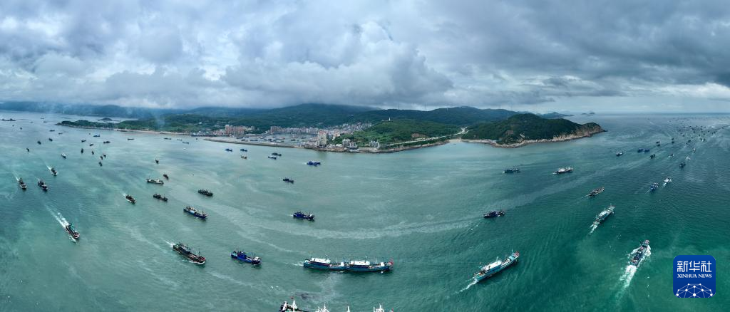 8月16日,在福建省福州市连江县黄岐国家中心渔港,渔船开渔出海(无人机全景照片)。