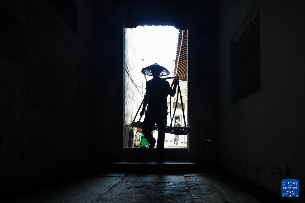 8月14日,诸暨市赵家镇花明泉村村民在何燮侯故居内挑担行走。花明泉村人何燮侯曾出任北京大学校长一职,他的故居被完好地保存下来。