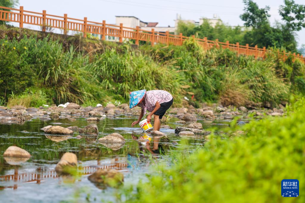 8月14日,诸暨市赵家镇花明泉村村民在黄檀溪中摸螺蛳。
