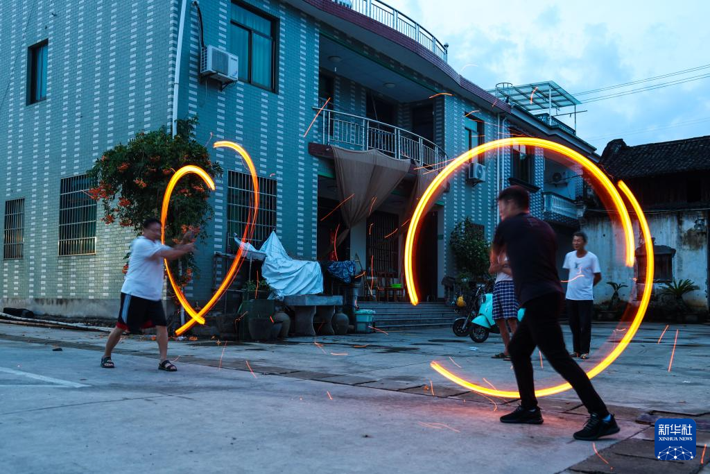 8月14日夜,诸暨市赵家镇花明泉村村民在村内空地练习赵家拳棒中的“火流星”技巧。