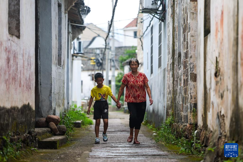 8月14日,诸暨市赵家镇花明泉村村民何金方(右)牵着孙子何豪杰走在村内的石板步道上。这处石板步道自清代建成后一直使用至今。