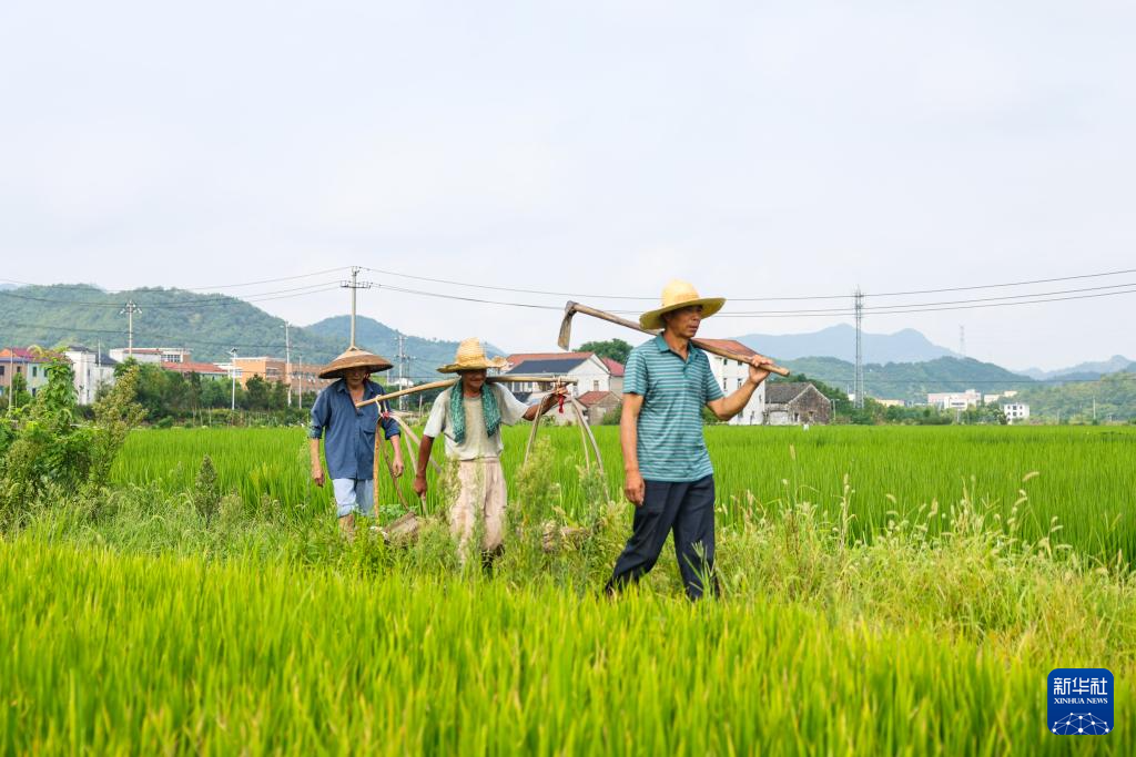 8月14日,干完农活的诸暨市赵家镇花明泉村村民行走在稻田中。