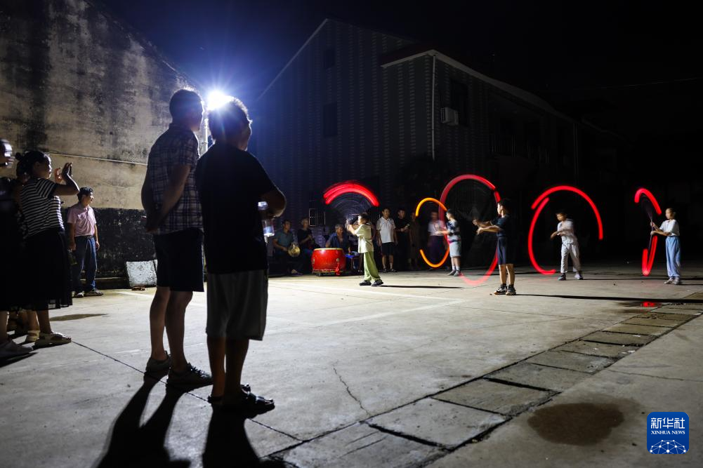8月14日夜,诸暨市赵家镇花明泉村村民观看本村少年练习赵家拳棒中的“火流星”技巧。