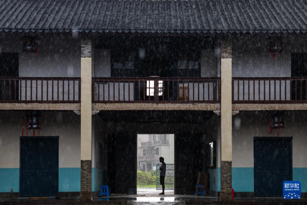 8月13日,诸暨市赵家镇花明泉村村民在懌善堂内避雨。懌善堂曾经是花明泉村小学的校舍,如今修葺一新后将成为花明泉村村史陈列馆。