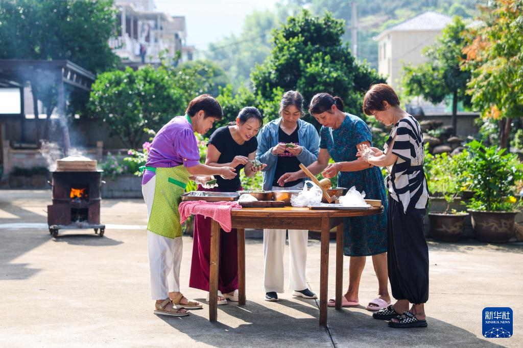 8月15日,诸暨市赵家镇花明泉村村民们一起制作当地特色食物青饺。