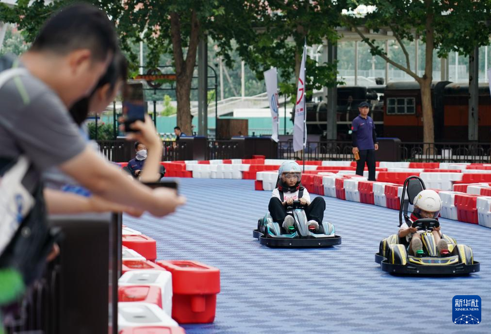8月18日,小朋友在北京汽车博物馆的室外场地上体验卡丁车。