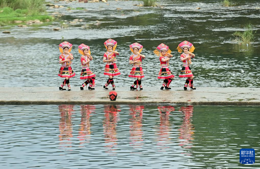 8月18日,在柳州市融水苗族自治县汪洞乡,村民们在改造后的河道上进行文艺表演。