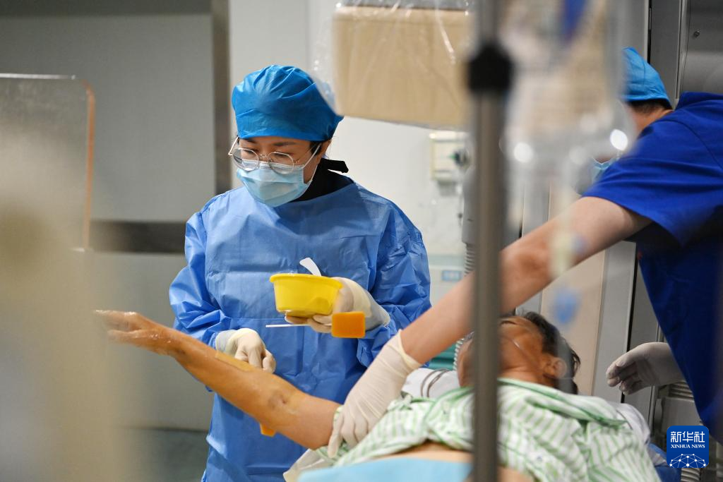 王丽在天津市第一中心医院(复康路院区)给病人消毒(8月15日摄)。