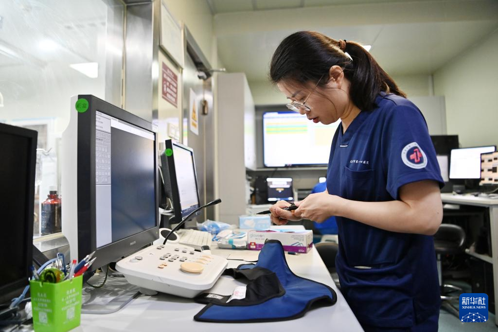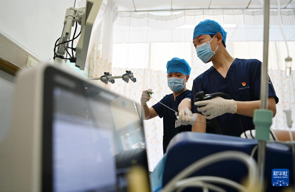 宋立君(右)在天津市第一中心医院(复康路院区)给病人做无痛胃镜检查(8月16日摄)。