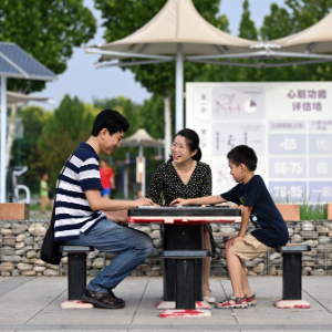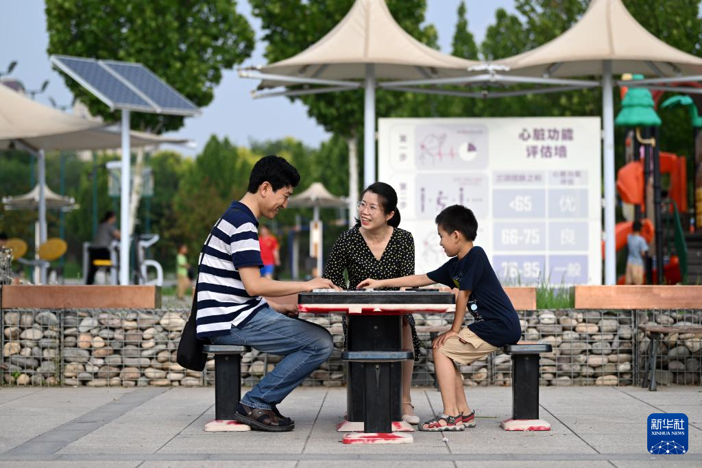 宋立君(左)和王丽(中)带着孩子在天津市水西公园内下棋(8月18日摄)。