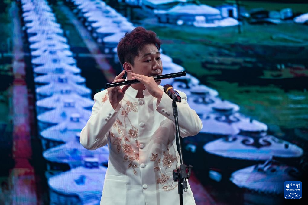 8月18日,在巴西圣保罗,西北民族大学艺术团成员在“中国的色彩:民族万花筒”晚会上吹奏笛子。
