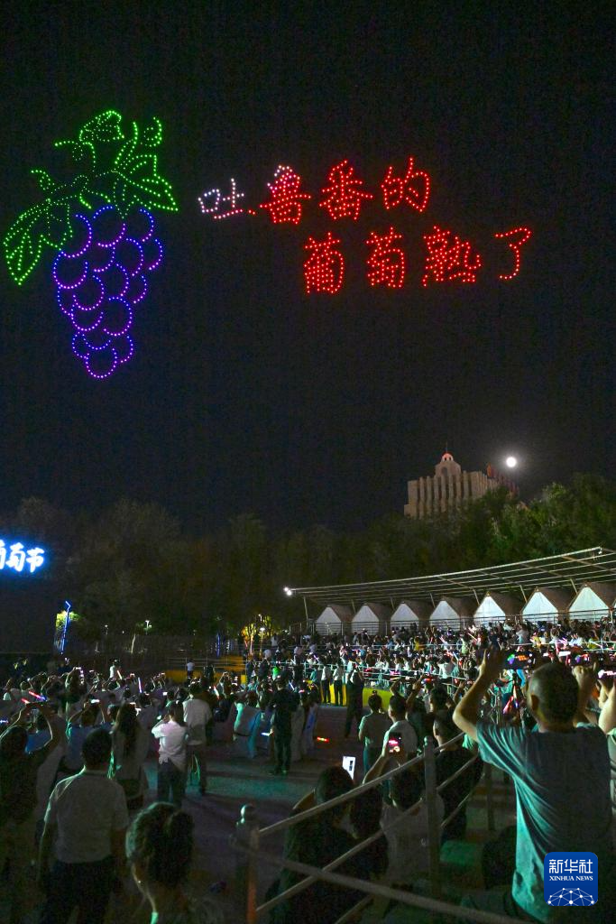 8月16日,人们在吐鲁番葡萄节开幕式现场观看无人机光影秀。