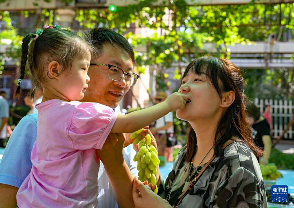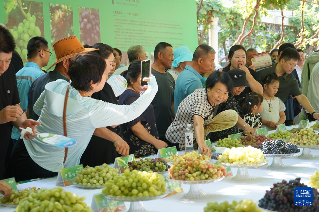 8月17日,人们在吐鲁番特色葡萄集市上品尝葡萄。